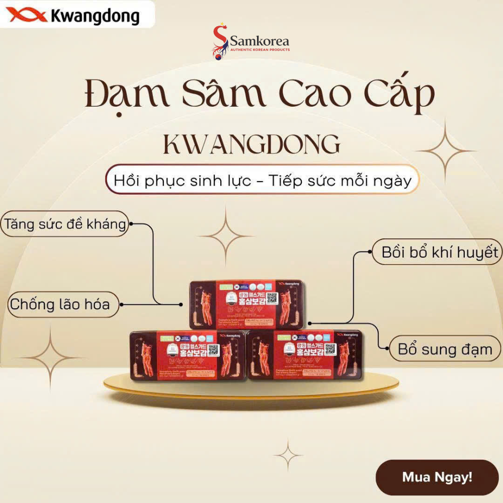 Viên Đạm Sâm Cao Cấp của tập đoàn dược phẩm Kwangdong (광동) là sản phẩm bổ sung dinh dưỡng, giúp bồi bổ cơ thể, tăng cường sức khỏe và hỗ trợ nâng cao thể trạng cho nhiều đối tượng, đặc biệt là người suy nhược và người lớn tuổi.